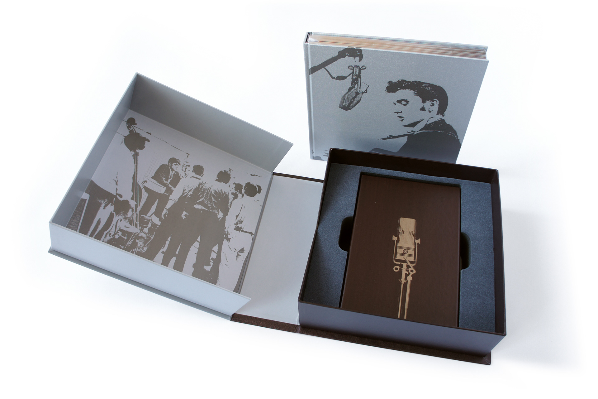 The Complete Elvis Presley Masters is accompanied by a silkscreened, silver-gilded hardcover book printed on archival paper and produced exclusively for this collection. This meticulously researched, lavishly illustrated 240-page book is, without question, the ultimate reference to the music of Elvis Presley. Also included is a complete chronological song index which lists each track with recording date, studio and musician information. The book is divided into 3 sections. The first with a foreword by producer Ernst Mikael Jørgensen and an essay by acclaimed Presley biographer Peter Guralnick to bring valuable historical context to the collection. In the second section you'll find the most comprehensive discography of Elvis' music ever produced, including album artwork and information on each single, EP and album released during the artist's lifetime, release dates, chart positions and catalog numbers illustrated with rare and classic photographs. The third section include a complete chronological song index which lists each track with recording date, studio and musician information, together with photographs of the original sound studio equipment.